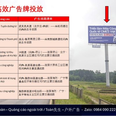 Chiến dịch quảng cáo ngoài trời CMES Vietnam 2025 do Bizman Media triển khai đã khẳng định hiệu quả vượt trội của billboard quốc lộ. Với mạng lưới vị trí vàng, khả năng tiếp cận hàng triệu lượt nhìn và tệp khách hàng doanh nghiệp chính xác, chiến dịch giúp doanh nghiệp Trung Quốc gia tăng nhận diện, thu hút đầu tư và lan tỏa thương hiệu CMES trên toàn Việt Nam – một bước tiến mạnh mẽ trong truyền thông công nghiệp quốc tế.