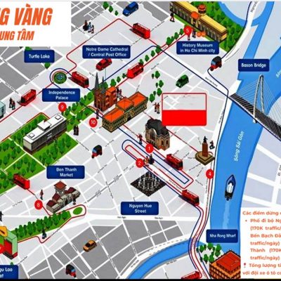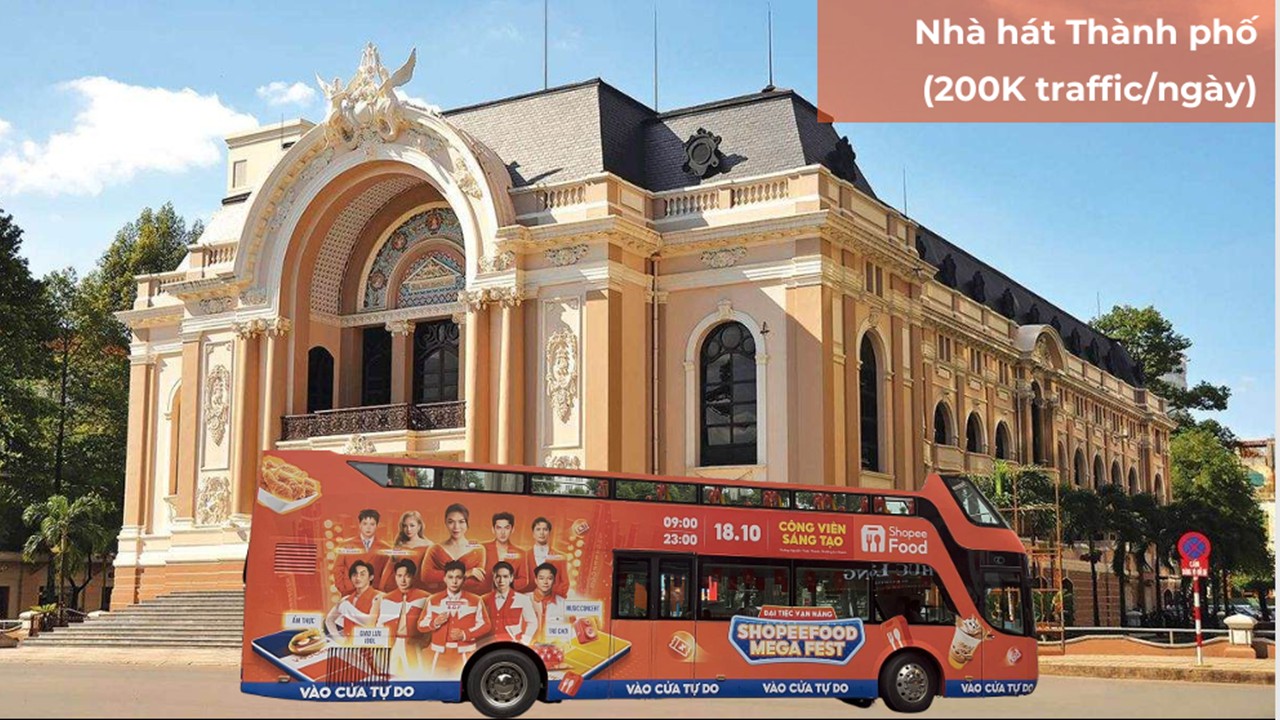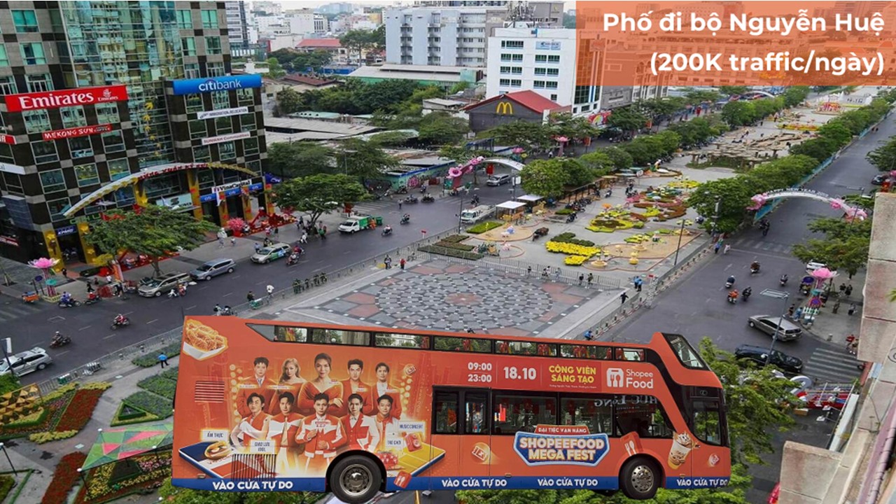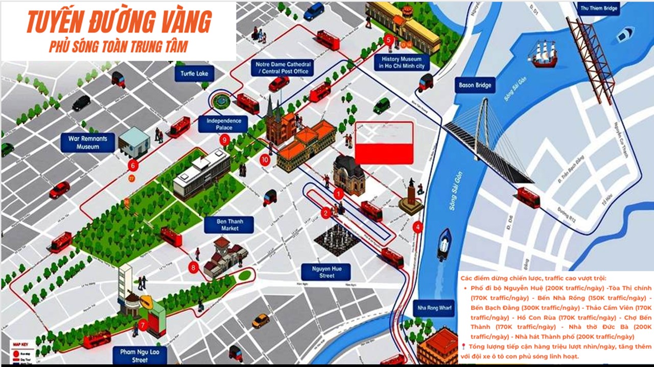 Lộ trình xe được thiết kế đi qua các trục đường trung tâm và điểm nóng traffic như Nguyễn Huệ, Đồng Khởi, Nhà hát Thành phố, Bến Nhà Rồng, Chợ Bến Thành, Nhà thờ Đức Bà, Bưu điện TP, Dinh Thống Nhất, nơi tập trung đông giới trẻ, dân văn phòng và khách du lịch. Với 7 chuyến mỗi ngày, quảng cáo được lặp lại nhiều lần trong các khung giờ khác nhau, giúp tăng mức độ ghi nhớ thương hiệu một cách tự nhiên.