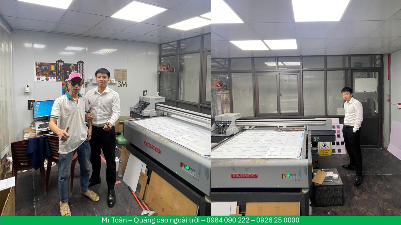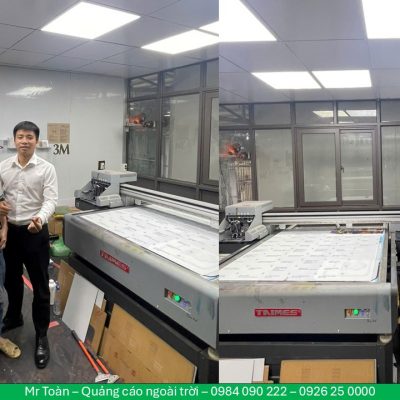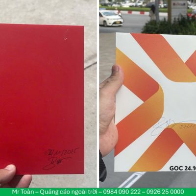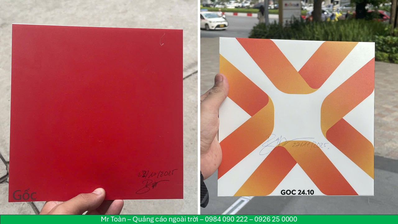 - In màu test trên đúng chất liệu sẽ dùng thật (mica, decal, alu, bạt…).